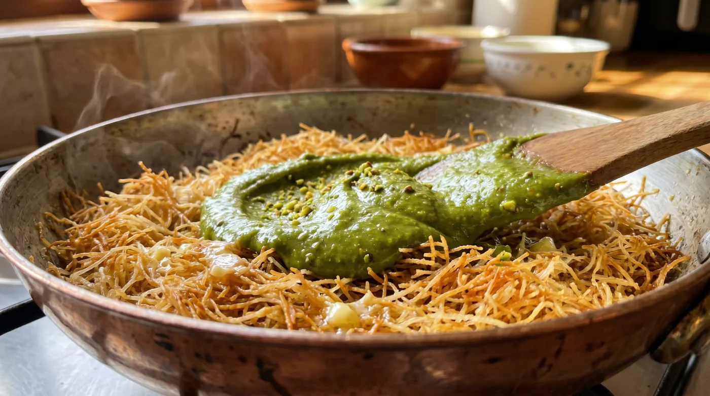 Çoğu standart tarif sana kadayıfı kavurup hemen ardından fıstık ezmesiyle karıştırmanı söyler. Bu, mutfakta düşebileceğin en büyük ve en yaygın tuzaktır. Kadayıf tellerini tavada kızarırken içlerindeki suyu tamamen kaybeden, dışı çıtır ve içi boş küçük süngerler gibi düşünmelisin. Görevleri, fıstığın yağını ve lezzetini içlerine çekmek, ama bunu yaparken yapılarını korumaktır.